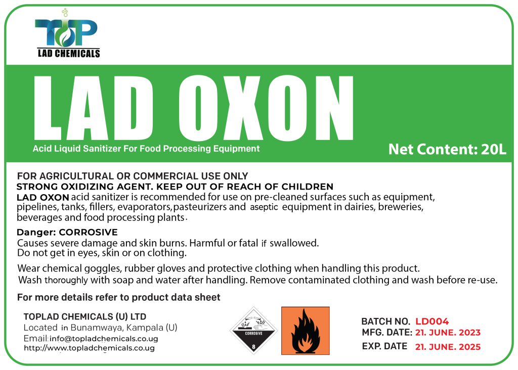 LAD OXON is a broad-spectrum peroxyacetic acid anti-microbial agent for use in a number of sanitizing applications in the brewery, beverage, dairy and food-processing industries.